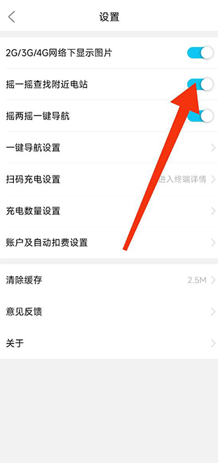 3、进入设置界面,点击摇一摇查找附近电站右侧按钮开启即可。