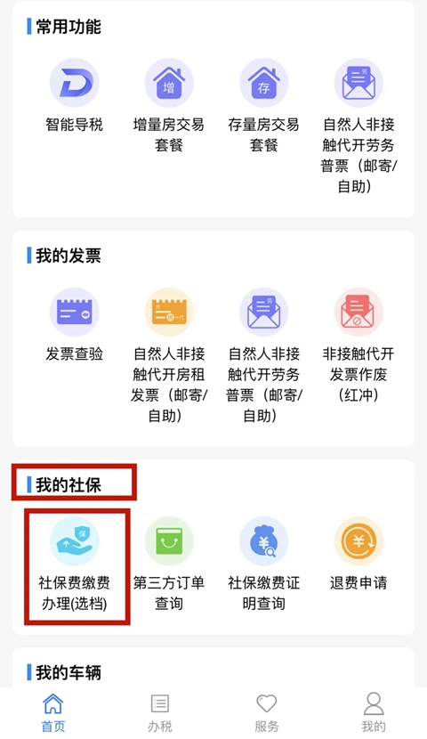 3、登录后,点击“首页”,找到“我的社保”,点击“社保费缴费办理(选档)”。