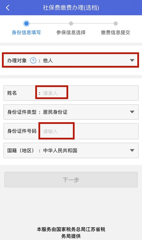 4、办理对象通过下拉框可以选择“本人”或“他人”,选择身份证件类型,填写姓名、身份证号,点击“下一步”。
