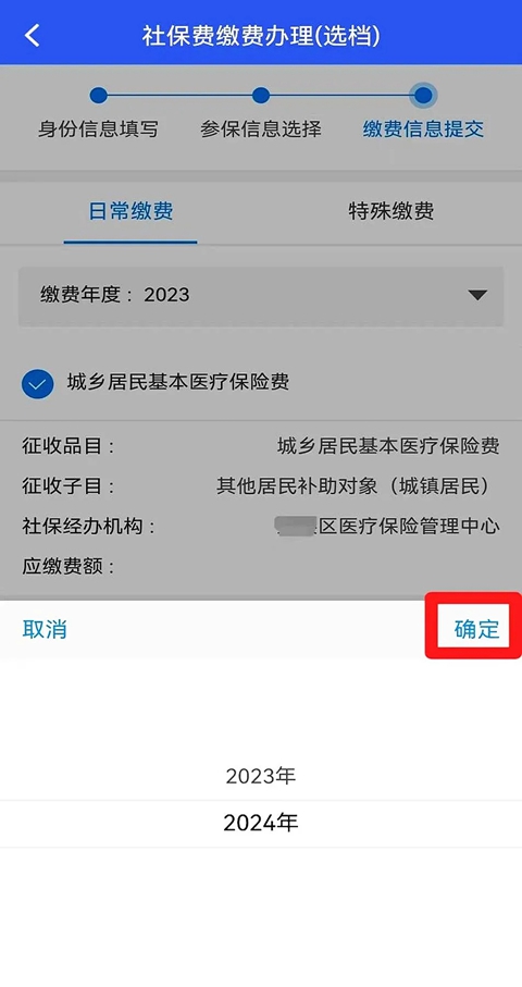 6、点击“缴费年度”右侧下拉键,选择“2025年”,点击“确定”。