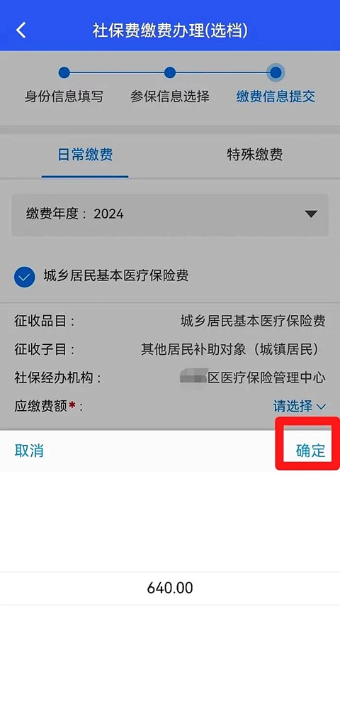 7、点击“应缴费额”右侧“请选择”下拉键,选择对应缴费金额,点击“确定”。