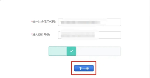 点击“一照一码户登记信息确认”,如为个体工商户,则选择“两证整合个体工商户登记信息确认”,输入统一社会信用代码与法人证件号码后,向右拖动滑块填充拼图,再点击“下一步”。