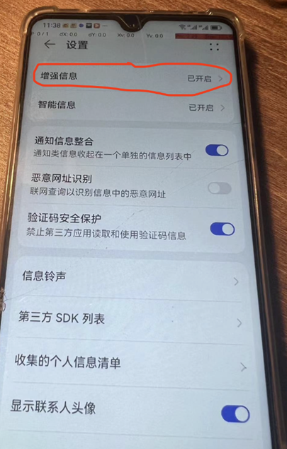 4、增强信息功能默认关闭,如需使用,您可以在信息应用的设置中打开,选择进入【增强信息】选项,打开增强信息开关。