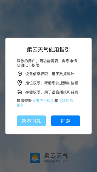 1、轻松下载并安装柔云天气app,阅读用户协议后,点击同意。
