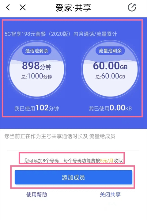 下面以“5G智享198元套餐(2020版)”为例,如何把用不完的流量通话共享给家人朋友(自助完成的方式):