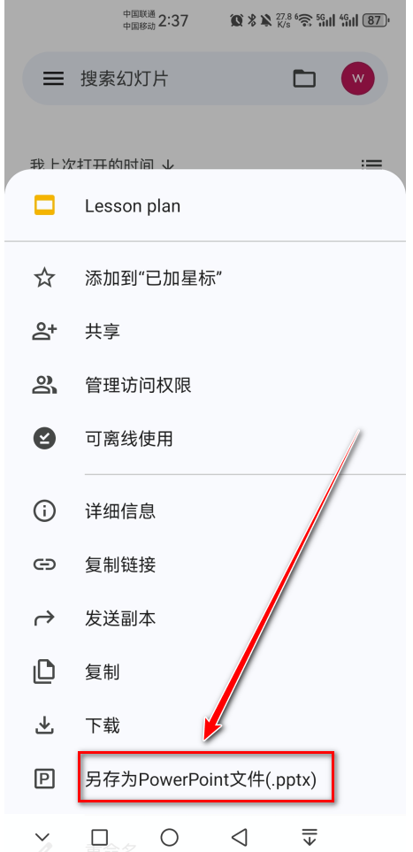 点击 “文件” → “下载”,选择格式(如PDF、PPTX、JPG等)保存到本地。
