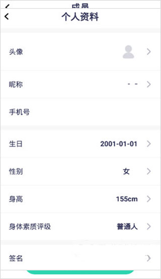 2、点击【添加成员】,输入家人信息,包括昵称、性别、身高、生日、身体素质评级。