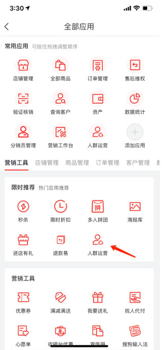 切换到APP首页,即“店铺”tab,点击“全部”,在“限时推荐”和“客户管理”里有“人群运营”入口,点击“人群运营”进入推荐人群列表。目前支持访问未支付客户、需重点召回客户、需重点发展客户、需重点活跃客户、需刺激消费客户5类人群创建运营计划。支持展示5类人群的定义和覆盖人数。