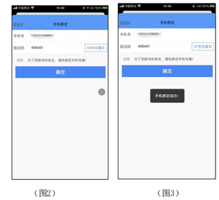 2、账号未绑定手机号的情况下,点击“登录”后,会进入手机绑定页面(见图2)。填写手机号,点击“获取验证码”,该手机号会收到验证码信息。正确填写验证码,点击“确定”,系统会提示绑定成功(见图3),并自动进入APP首页。