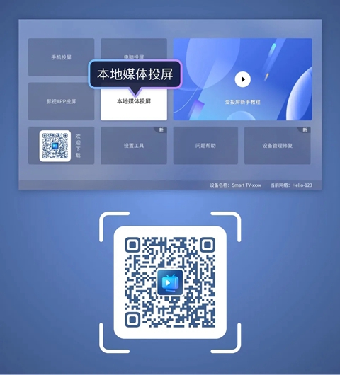 1、电视打开爱投屏→进入本地媒体投屏,扫描二维码下载安装手机爱投屏;