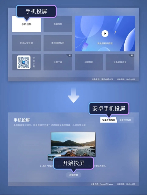 1、电视打开爱投屏→手机投屏,进入安卓手机投屏界面点击“开始投屏”按钮,查看连接设备名称——“Android-xxxx”或“Smart TV-xxxx”(部分电视支持此功能)