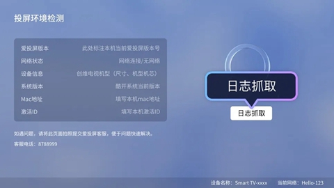 2、投屏中遇到问题需客服解答可点击"日志抓取",同时再次进行投屏便于抓取问题,点击弹框保存按钮即可——