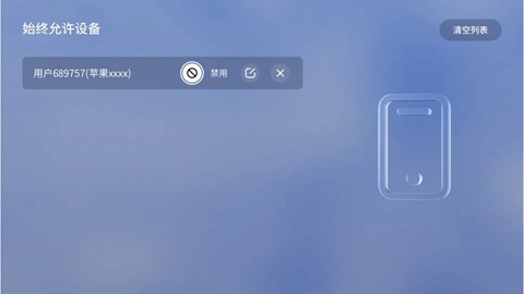 2、始终允许设备与禁止投屏设备列表相反,为手动始终允许投屏的的所有投屏设备。该列表下的设备投屏时也可以手动操作禁止,禁止后则进入禁止投屏设备列表中,如何操作解禁即可参照禁止投屏设备列表指示方法即可。