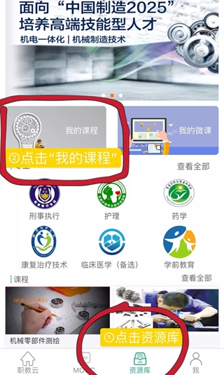 1、下载登录云课堂智慧职教APP,点击最下方4选项中的“资源库”点击左上角“我的课程”所选的3门课程将出现在栏目里,再按照课程学习要求及时完成学习任务。