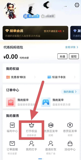 在成为“普通打手”就可以接单了,但只能接“标准单”、“抢单”、“陪练”,价格相对较低。想要接到价格更高的“优质单”和“悬赏单”,就需要进入“打手权益”里选择专区,进行考核或缴纳保证金,然后才能接单。我的→打手权益→选择“三角洲行动精英护航专区”/“优质X王者农药”/“极速打手”/“荣耀打手”/“优质区X撸啊撸手游”→考核→接单