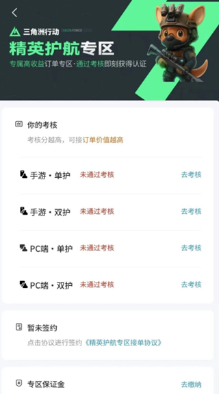 三角洲行动精英护航专区专属高收益订单专区,考核分“手游单护/双护,PC端单护/双护”,考核分数越高,可接订单价值越高,专区需缴纳“专区保证金”