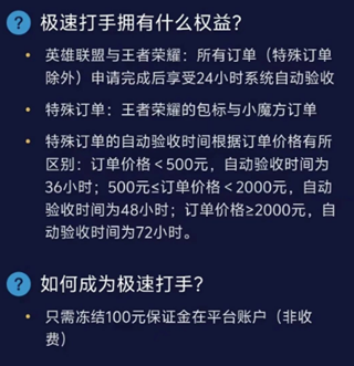 极速打手只需冻结100元保证金在平台账户(非收费),就可以享受订单完单后24小时自动验收