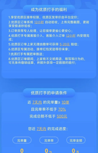 优质区X撸啊撸手游近7天内的完单量≥10单,且完单率不低于70%,完成总额不低于500元,就能享受“优质区接单权限”,订单完成后系统12小时自动验收