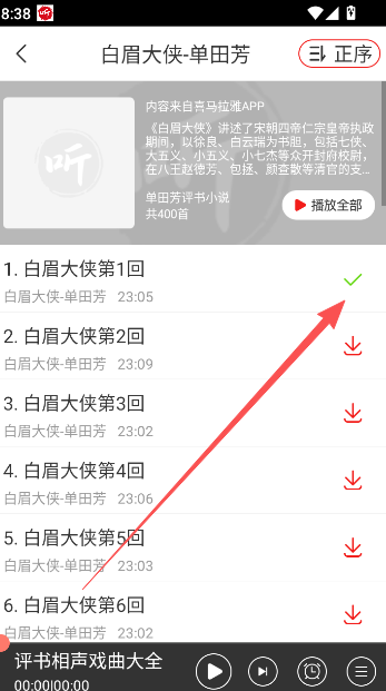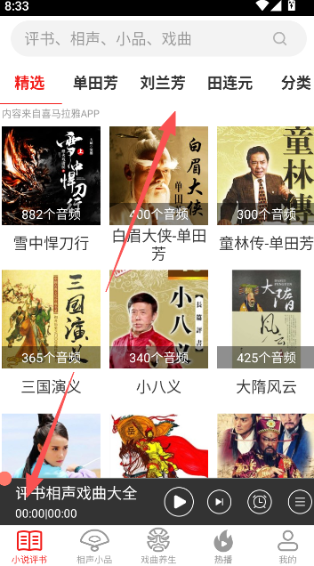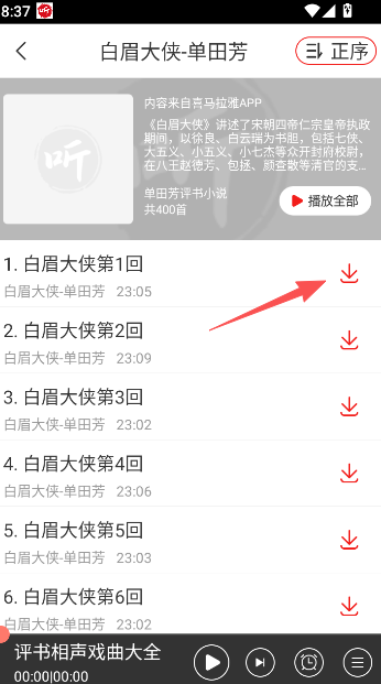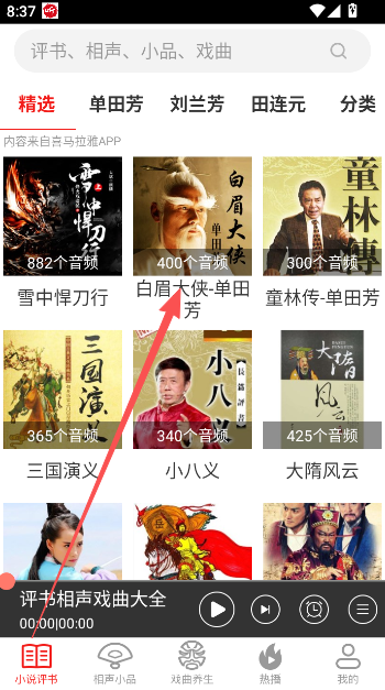 1、在各栏目的分类中,找到一个你喜欢的资源开始播放,比如小编这里想要下载单田芳先生说书的《白眉大侠》。