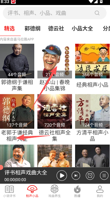 2、为大家按照各名家的经典进行了详细分类,点击栏目进行播放收听就行。