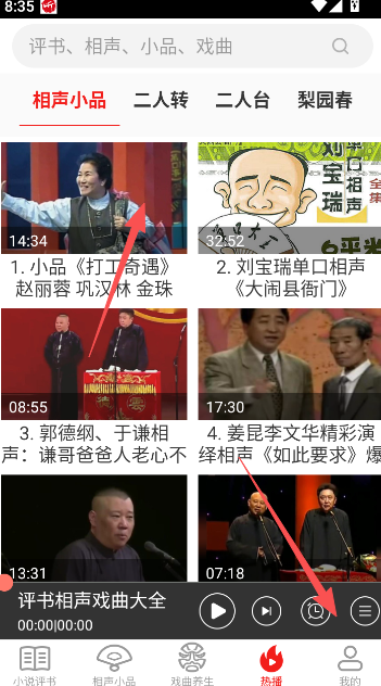 1、下载软件进入, 可以看到主要有小说评书、相声小品、戏曲养生、热播以及我的等版块。