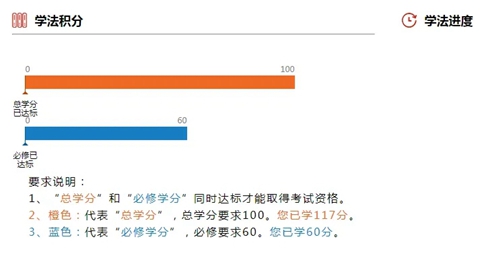 学员必须在考试前一天晚上9点之前完成学分累积,总学分达100分且必修学分达60分,方可获取网上考法资格。
