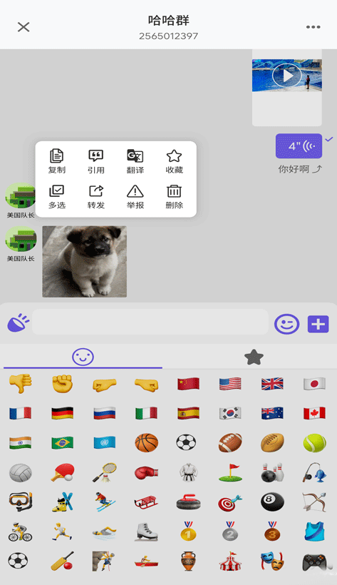 3、在聊天群中可以发送消息,或点击输入框旁边的按钮发送表情包、语音、图片等;