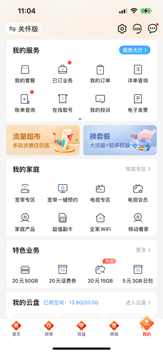 我的移动:历史账单、积分余额、套餐余量、个人信息一站式查询。