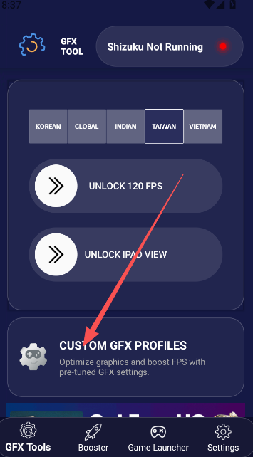 1、下载软件进入,选择所在的游戏区服,接着点击下方的游戏画质帧率部分开始解锁修改。