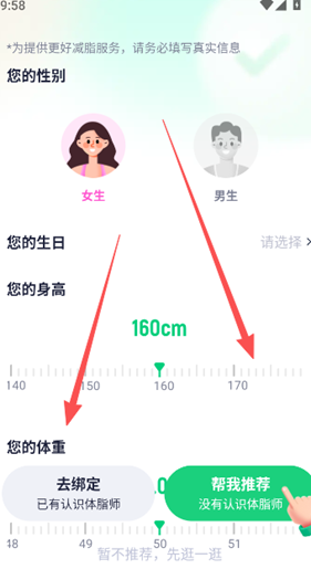 2、选择性别并完善身高体重等信息,选择是否需要体脂师。