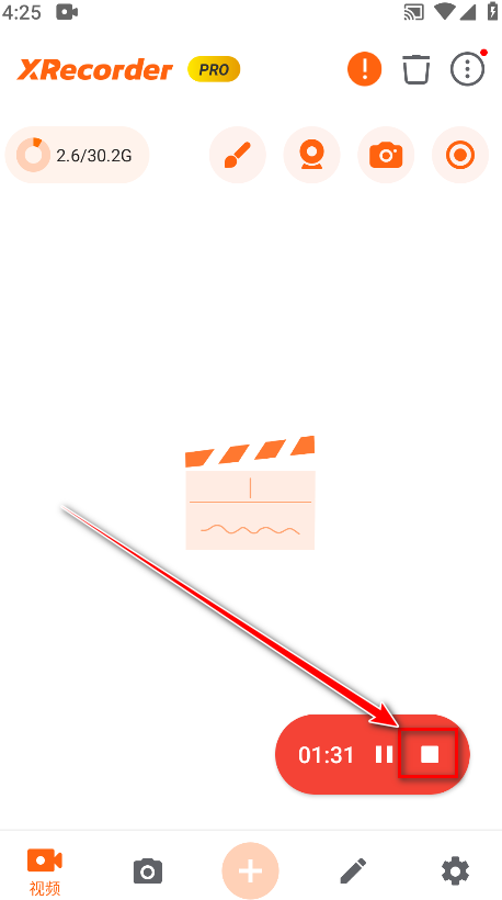 录制过程中点击悬浮窗的「停止」按钮(红色方形图标),或返回XRecorder主界面点击「停止录制」,视频将自动保存至应用内置的「视频库」或「作品列表」。