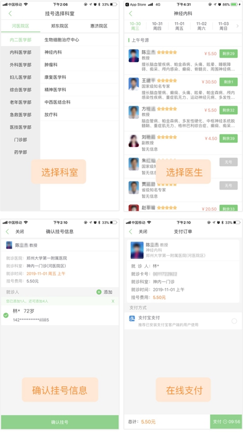 在“预约”模块下进行预约挂号与当天挂号,选择挂号科室、医生、预约日期并通过在线支付完成挂号,生成挂号订单。