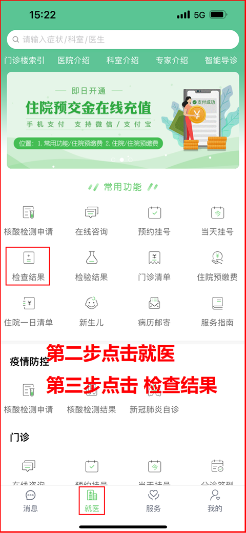 1、打开“郑大一附院掌上医院”App,点击注册绑定就诊人员信息查看报告点击“就医”然后点击“检查结果”。