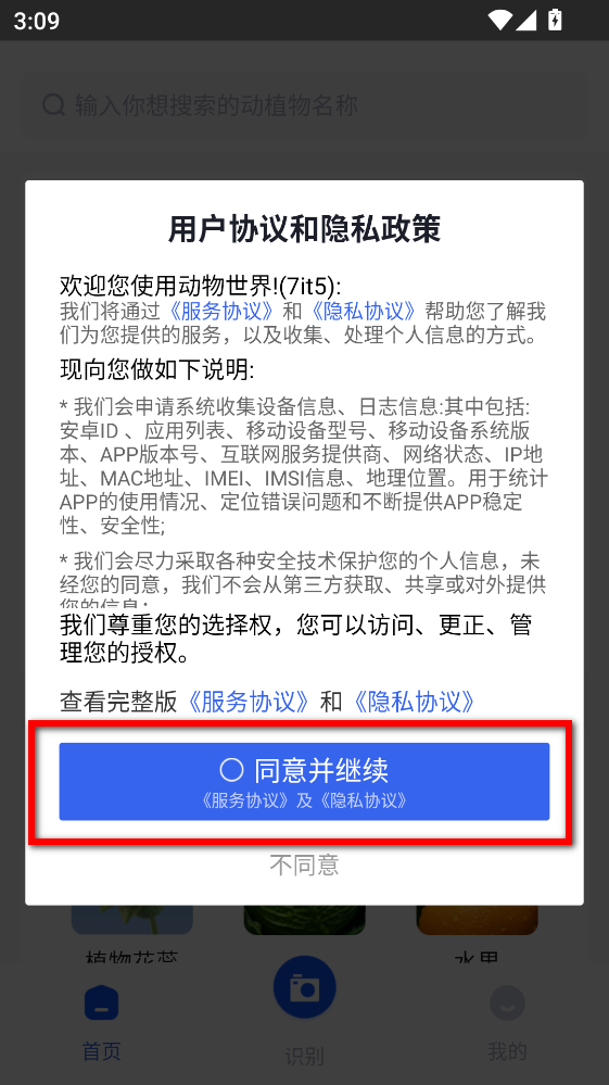 1、打开动物世界app之后,首先需要同意协议和政策。