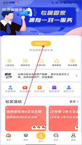 1、进入安居公社app首页,点击添加房产,如图所示。