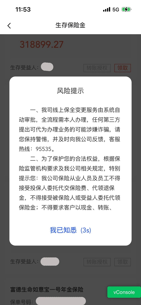 第1步:【选择保单】登录生名云服务APP,在常用功能模块点击“生存保险金”,查看待领取的保单,点击“领取”,弹出风险提示(不允许跳过)。