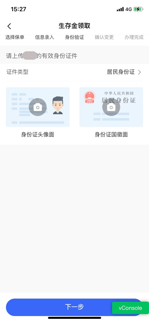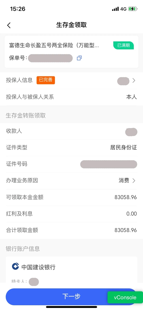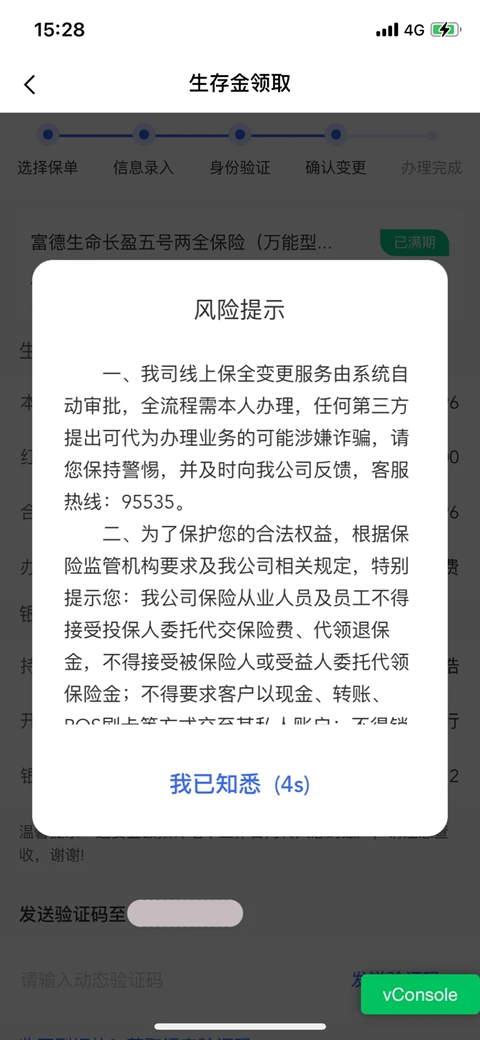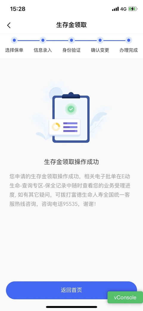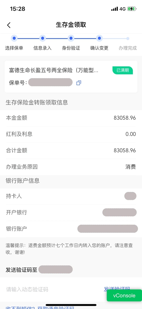 第4步:【确认变更】确认生存金领取金额及银行卡信息,公司向领取资格人保单层移动电话发送6位数校验码,点击“下一步”后,则完成操作完成。