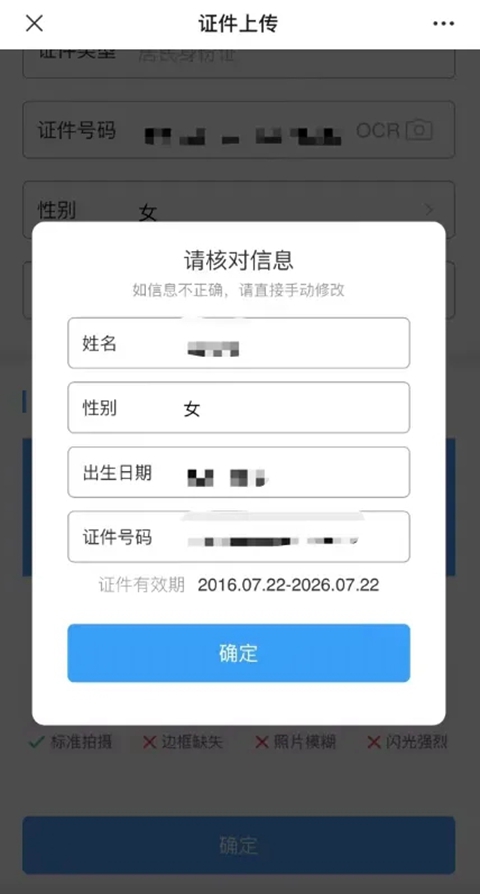 通过OCR技术获取的证件有效期过期时,系统会提示客户身份证已失效,此时不允许上传证件影像;