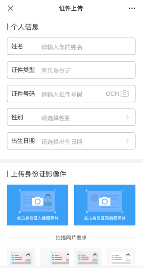 第2步:信息录入进入证件上传功能界面,需手动录入或者OCR扫描身份证影像来获取客户姓名、身份证号码等个人信息。同时确保与系统录入客户信息进行匹对一致。