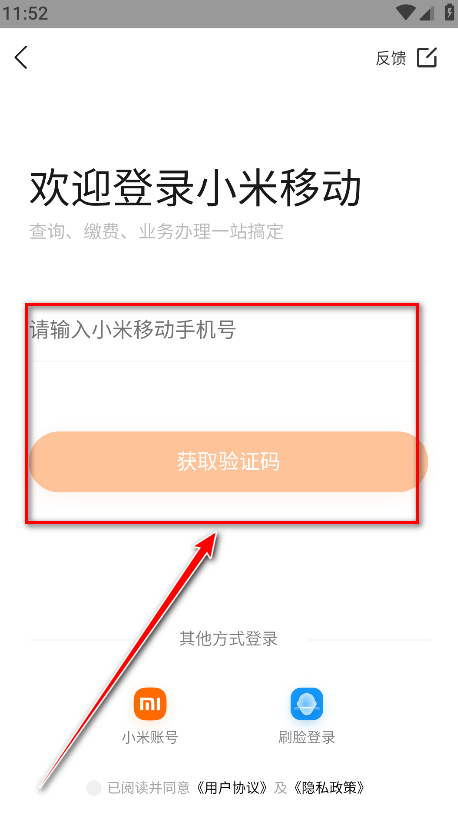 2.输入小米移动手机号和验证码进行登录。小编穷没有买小米移动手机号就登录不上这个软件,所以后续就演示不了,大家登录之后进入首页找到查话费即可查询话费余额哈。