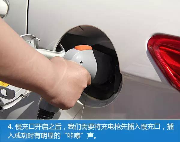 4、将充电枪插入慢充口,出现咔嗞声即插入成功。