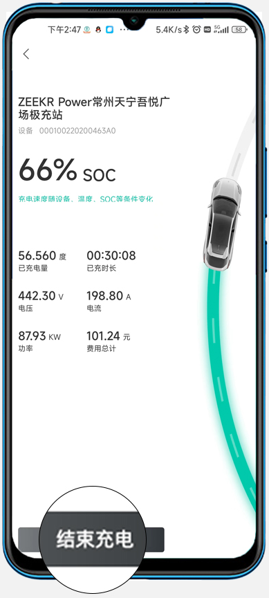 进入充电中页面,点击“结束充电”,成功跳转订单详情页,按下充电枪头按钮拔枪。