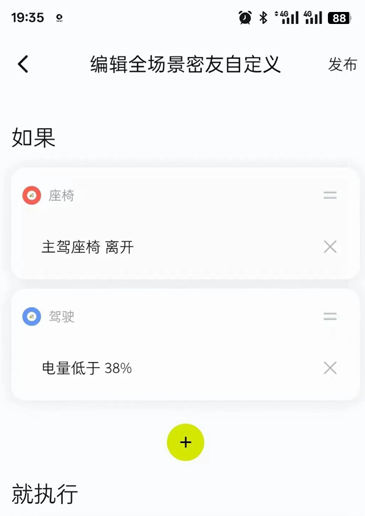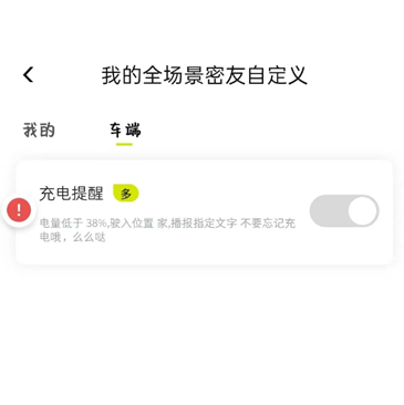 6、后面改成 “主驾离座”+“电量<38%” 才触发,这样一下车就听到提醒,屏幕上还会显示文字,绝对正当时。