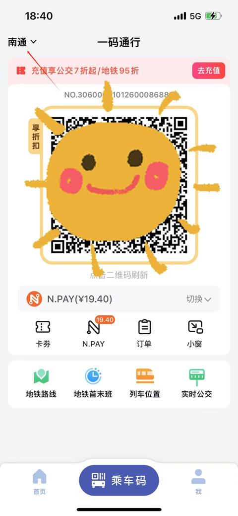 5、在乘坐地铁的时候,打开南通地铁APP,点击乘车码在过闸处即可出示乘车码乘车。