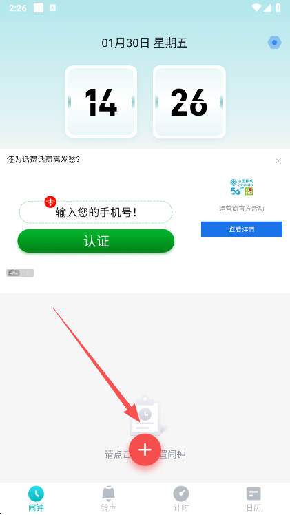 1、在本站下载安装打开,进入首页点击+号设置闹钟
