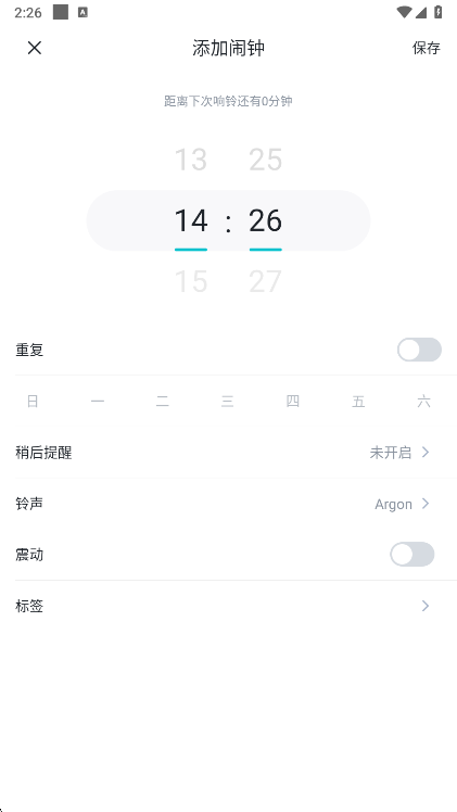 2、输入闹钟时间,保存即可