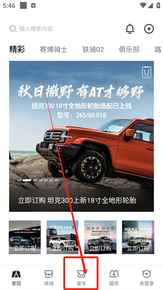 1、下载安装并打开坦克TANK,在主页点击中间的爱车页面。