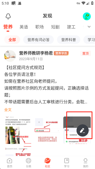 2、进入社区页面,点击笔一样的图标。