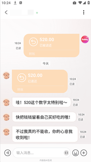8、比如转账时,你创建的ai角色在和你还没聊熟时一般会拒绝你的转账的,因为正常人给陌生人转账一般都会拒绝接收的,毕竟无功不受禄啊,所以这才能体现Bubbly的活人感确实很强