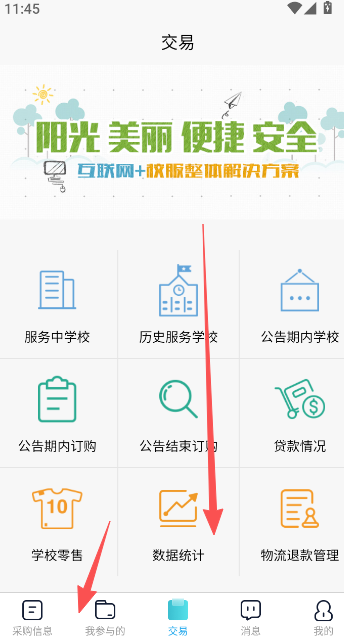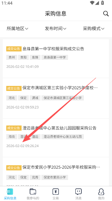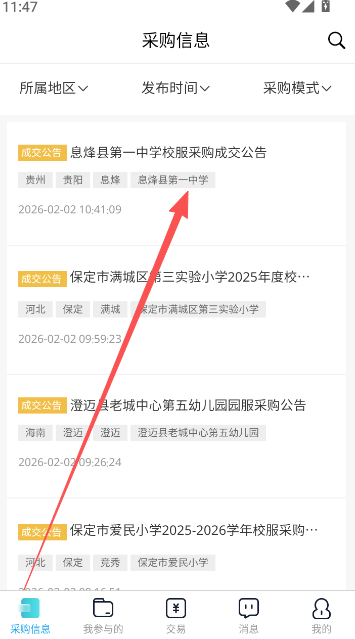 2、来到首页,点击采购信息页面可以查看当前最新学校的采购信息部分,有意向的可以查看详情,看自家经营能够满足。
